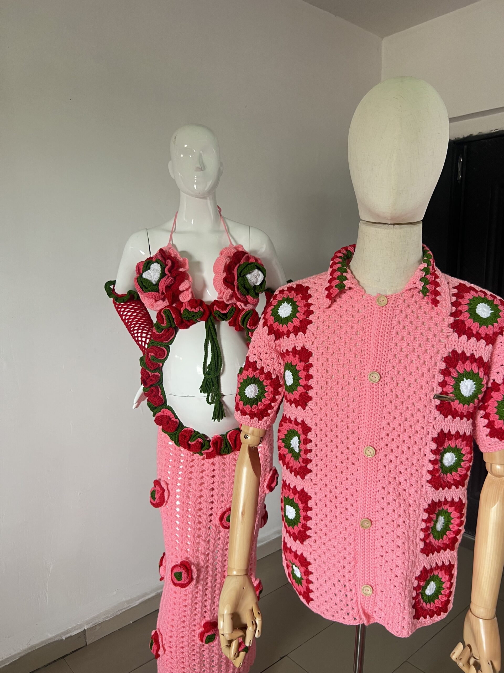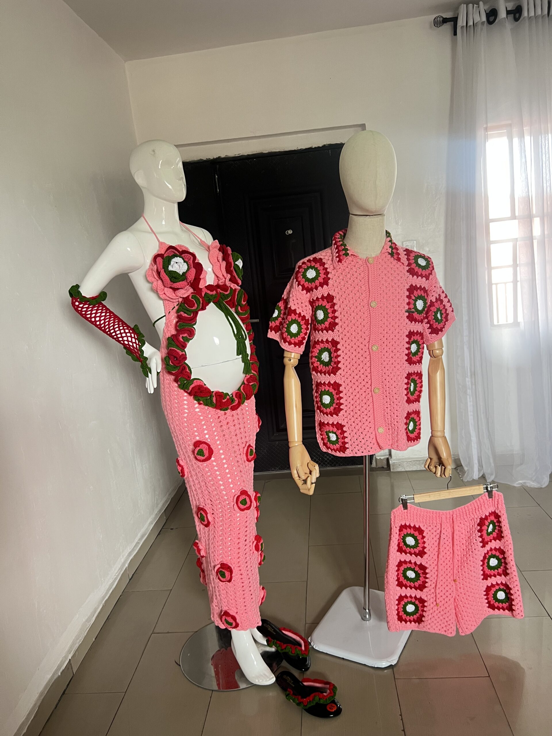 - Handcrafted maternity dress, gloves, footwear, earrings, and men’s shirt and shorts